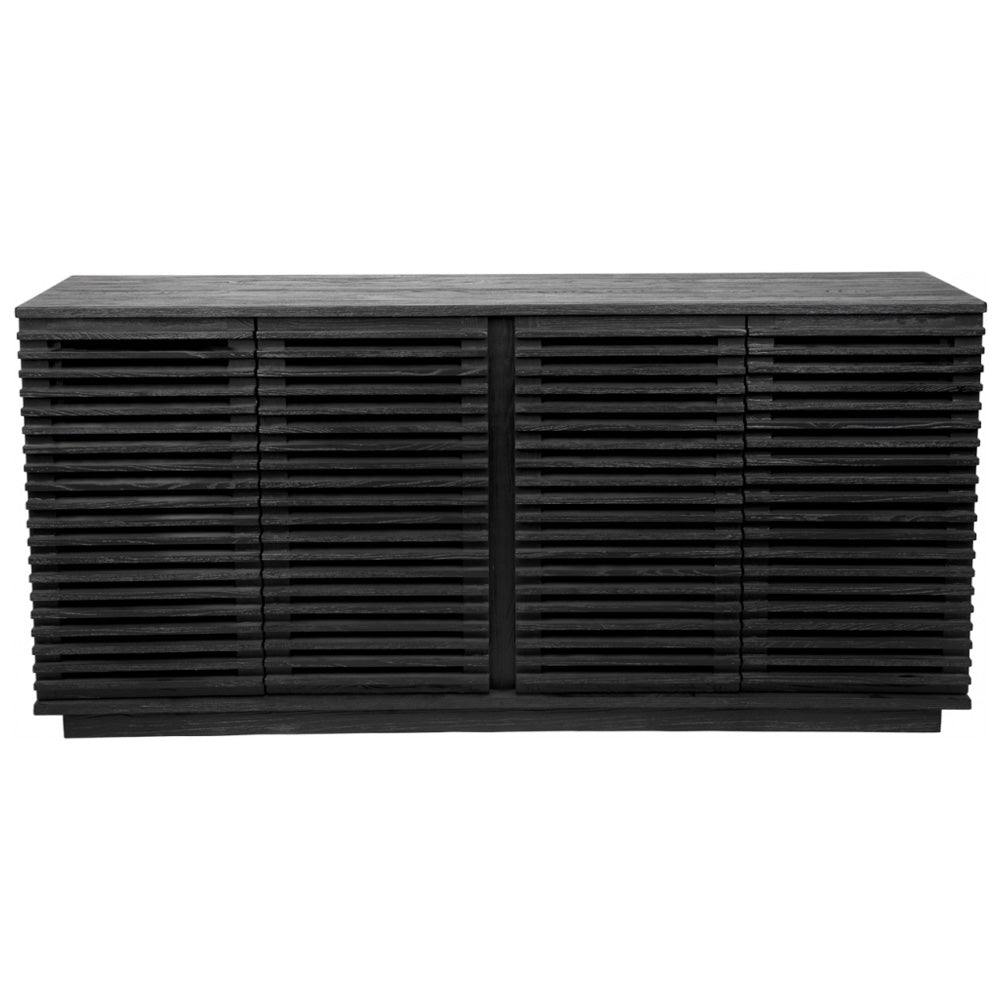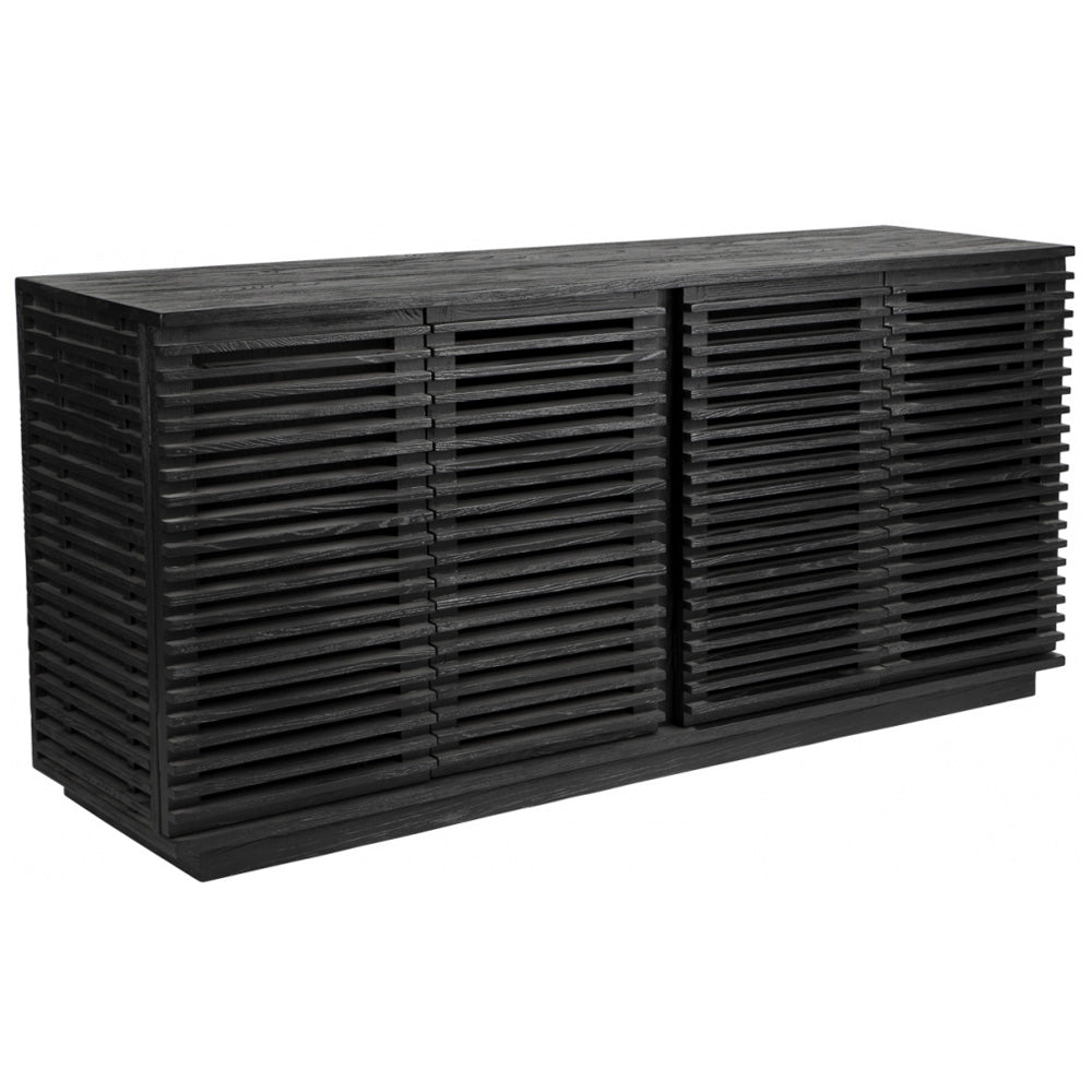 The buffet is a four door solid oak finished in a black painted finish, featuring a slatted design across the front and sides