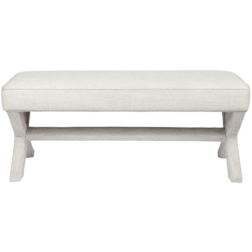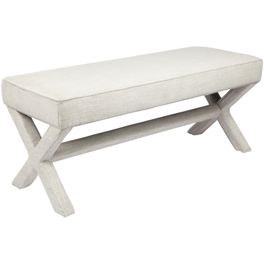 The bed end is natural upholstered. Legs are upholstered in the same fabric with detailed piping.