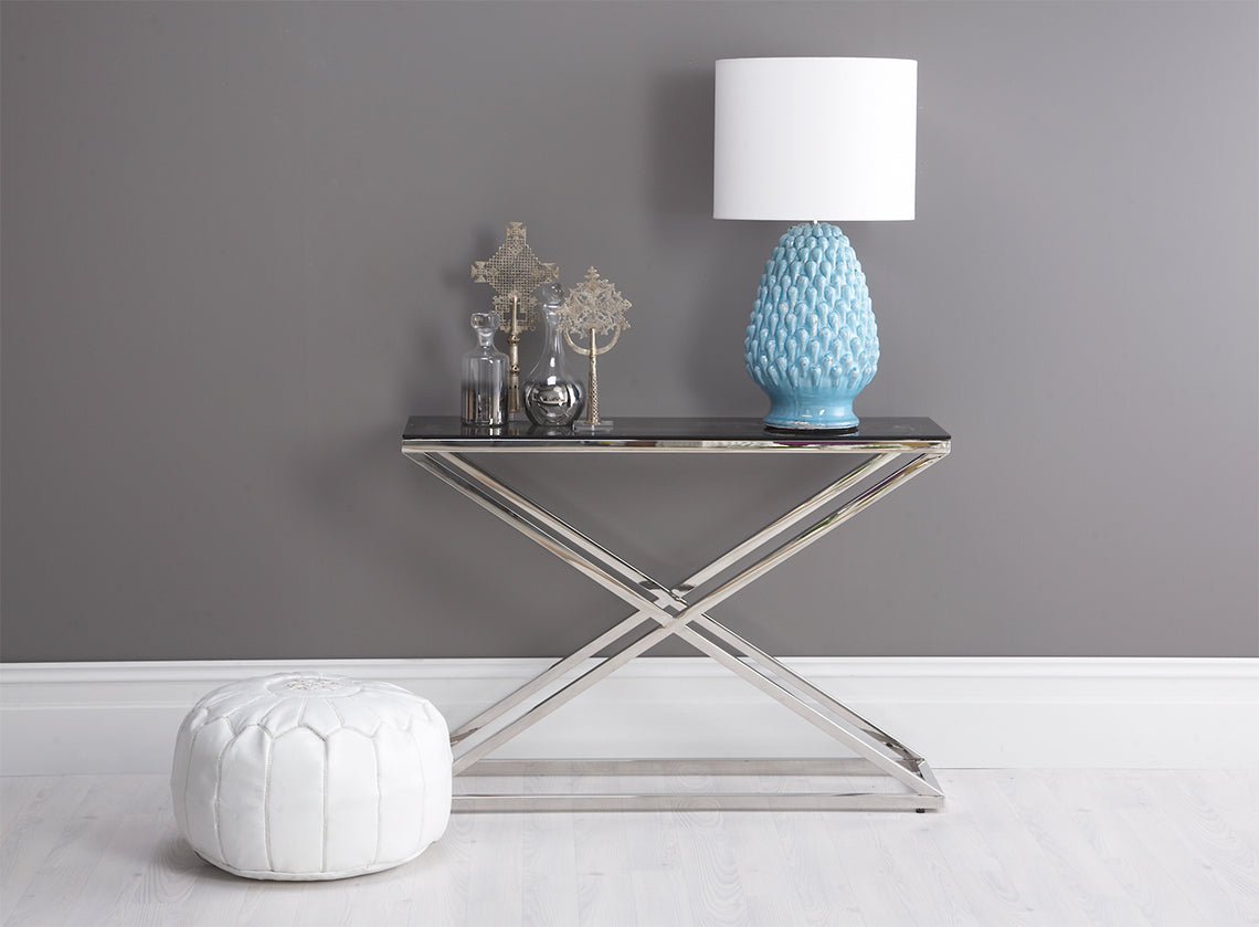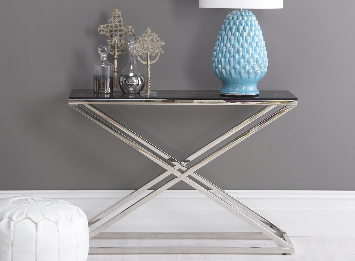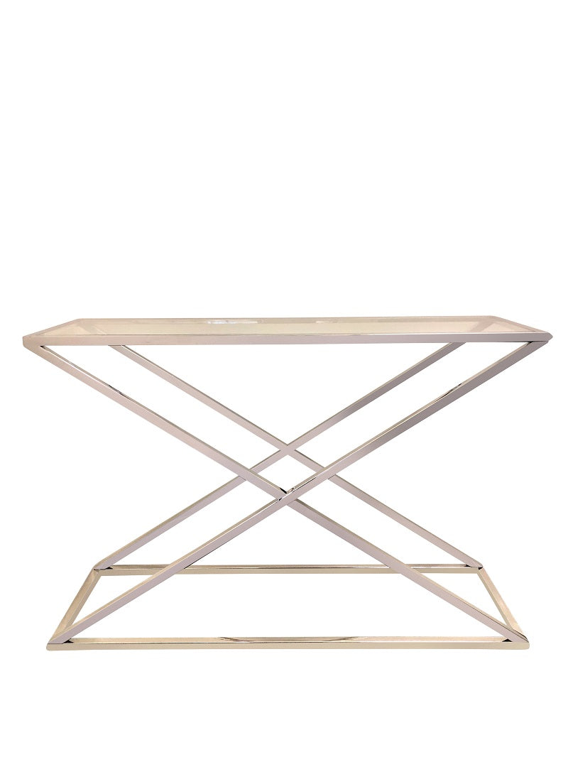 This elegant console table is a beautiful piece as an entry or sofa table. The modern cross frame design is made from a polished stainless steel frame with a 10mm tempered glass top.