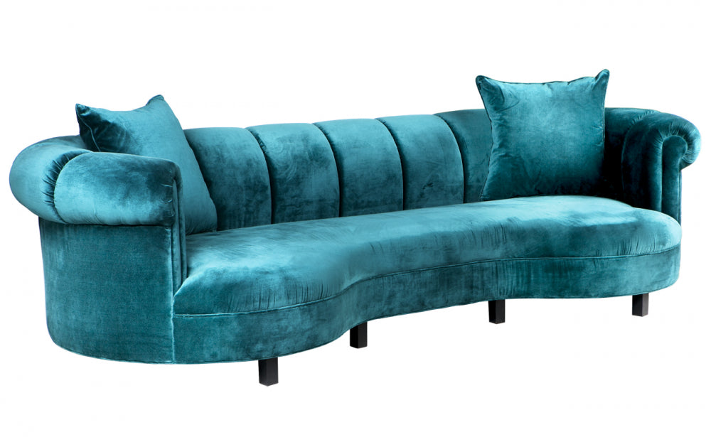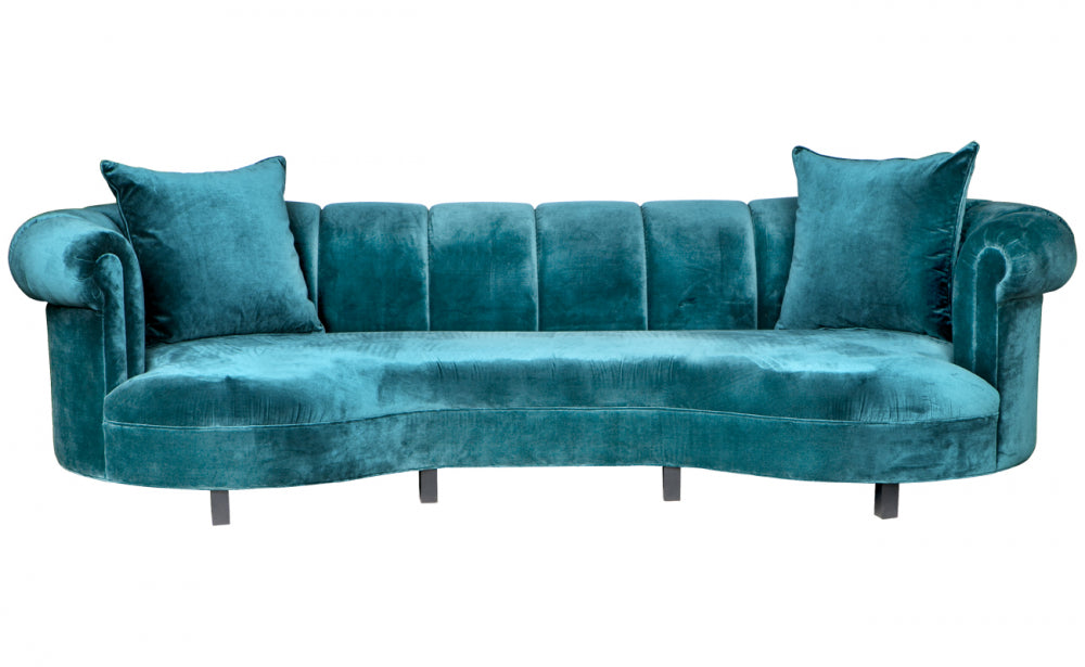 STRICTLY LIMITED EDITION: The Devine 3 Seat Sofa is a stunning teal green sofa upholstered in luxurious velvet. It's curved feature with panelled back and rolled arms and back make it a creative and bold feature in a room. It comes with black legs with two matching scatter cushions. This sofa is made of 95% Polyester, 5% Cotton. If you want to create a room that is unique and has impact, this sofa can certainly be the basis of a dramatic and fabulous look.