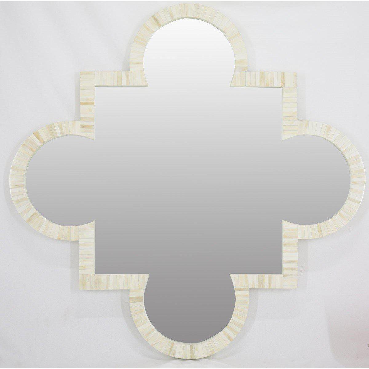 Add an exotic element to your home with this stunning Indian Quatrefoil Bone Inlay Mirror in Natural. This mirror has a stunning frame made from natural camel-bone inlay pieces. This generously sized mirror works well over a piece of furniture such as a chest of drawers or console, alternatively it can be used as stand-alone piece or even a statement a stunning bathroom mirror.