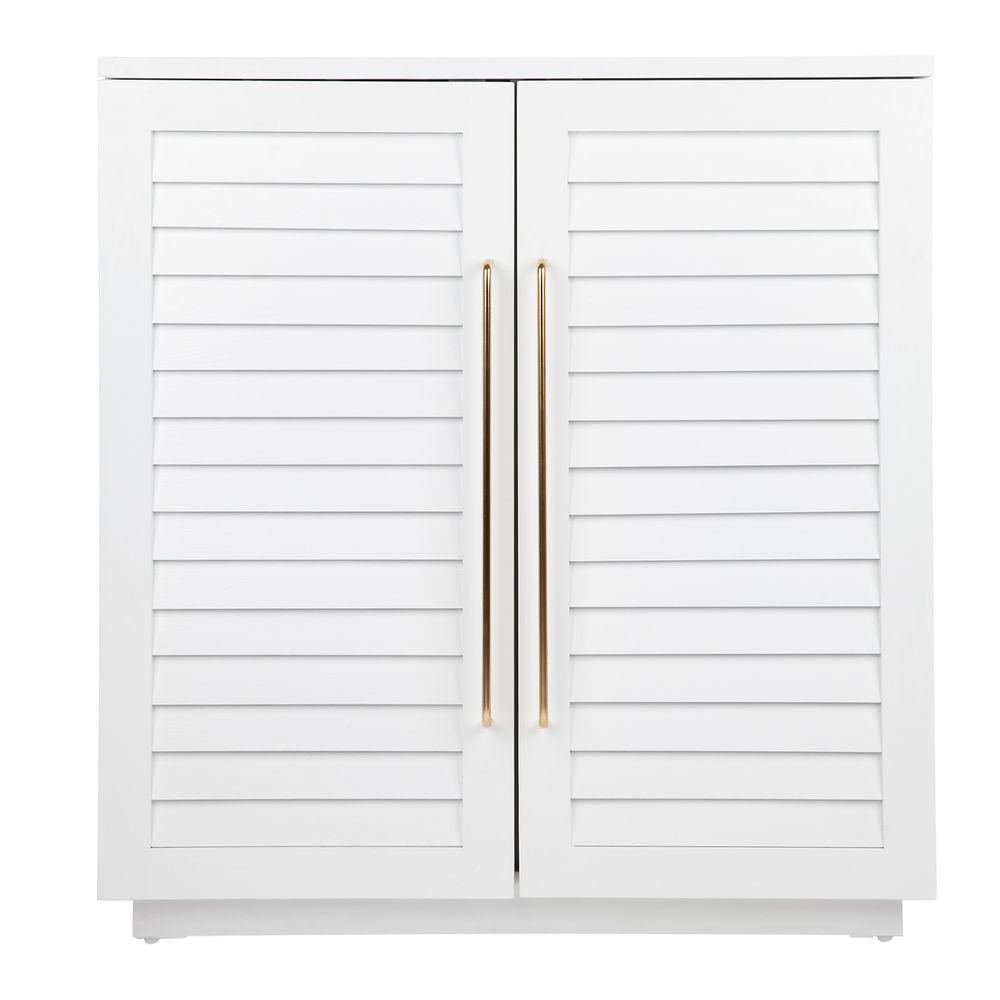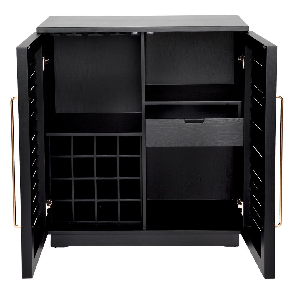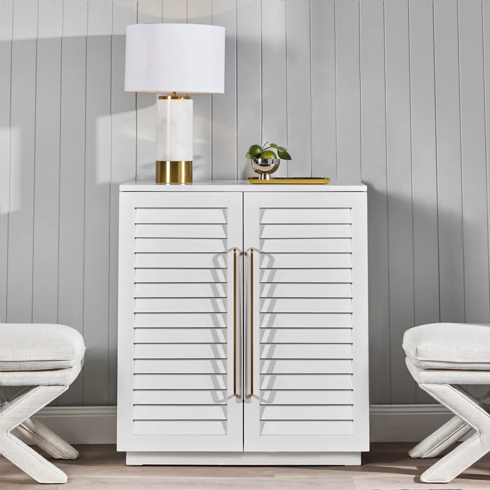 Delivering cool plantation vibes, the Loft oak drinks cabinet consists of two louvered doors opening to a well designed drinks storage system. Complete with an internal draw, shelving, wine bottle and glass rack, the Loft oak drinks cabinet is an effortlessly stylish and practical furniture piece. Featuring a beautiful oak veneer, the timber texture adds gentle charm through the fresh painted finish. Two elongated brushed brass handles further enhancing its striking profile adding a dash of understated luxe.
