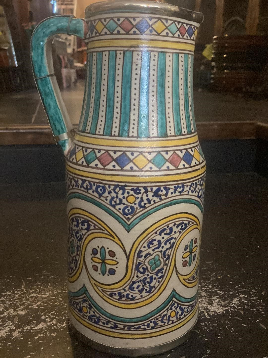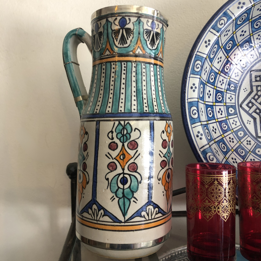 The Moorish Fez Jug is a beautiful and authentic item from Morocco. Just one piece can add flavour and intrigue to your Boho Chic or Moroccan decor or a set can be a luxurious grouping of artisan items. The Moorish Fez Jug in Blue is made in a traditional pattern dating back to the middle ages. It's intricate pattern in a royal blue would enhance any table setting - contemporary or boho . Mix and match these beautiful pieces for a contemporary spin on an ancient art. It also features beautiful silver nickel detailing on the rim and the handle.