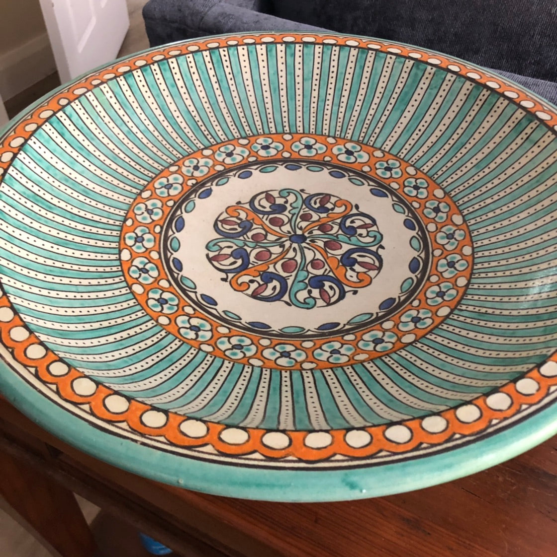 The Moorish Fez Serving Bowl is a beautiful and authentic item from Morocco. Just one Small Bowl can add flavour and intrigue to your Boho Chic or Moroccan decor or a set can be a luxurious grouping of artisan items. The Moorish Fez Bowl is made in a traditional pattern dating back to the middle ages. It's rich combination of gorgeous blues, oranges and reds are tied together with a turquoise rim. Mix and match these beautiful pieces for a contemporary spin on an ancient art.