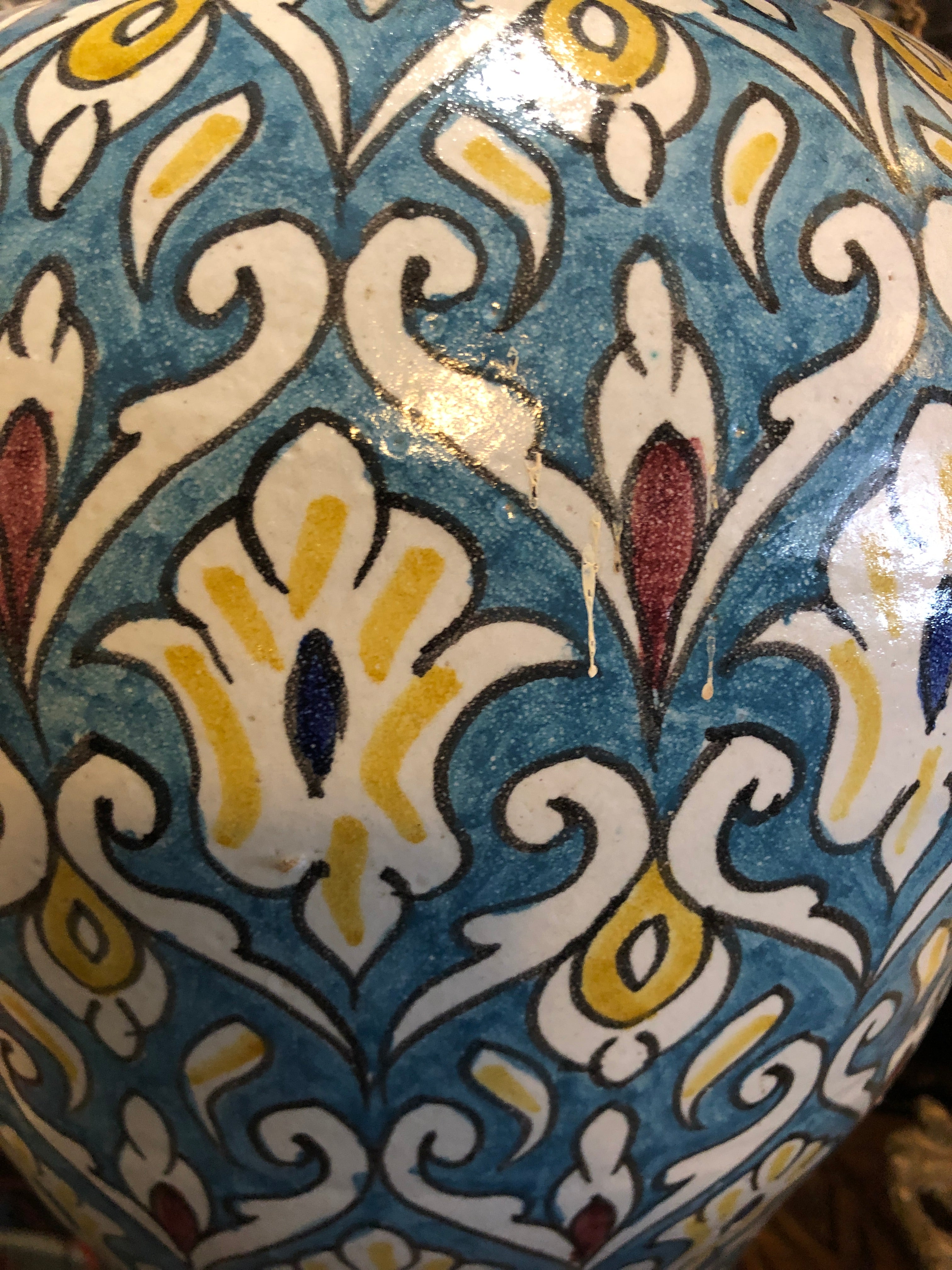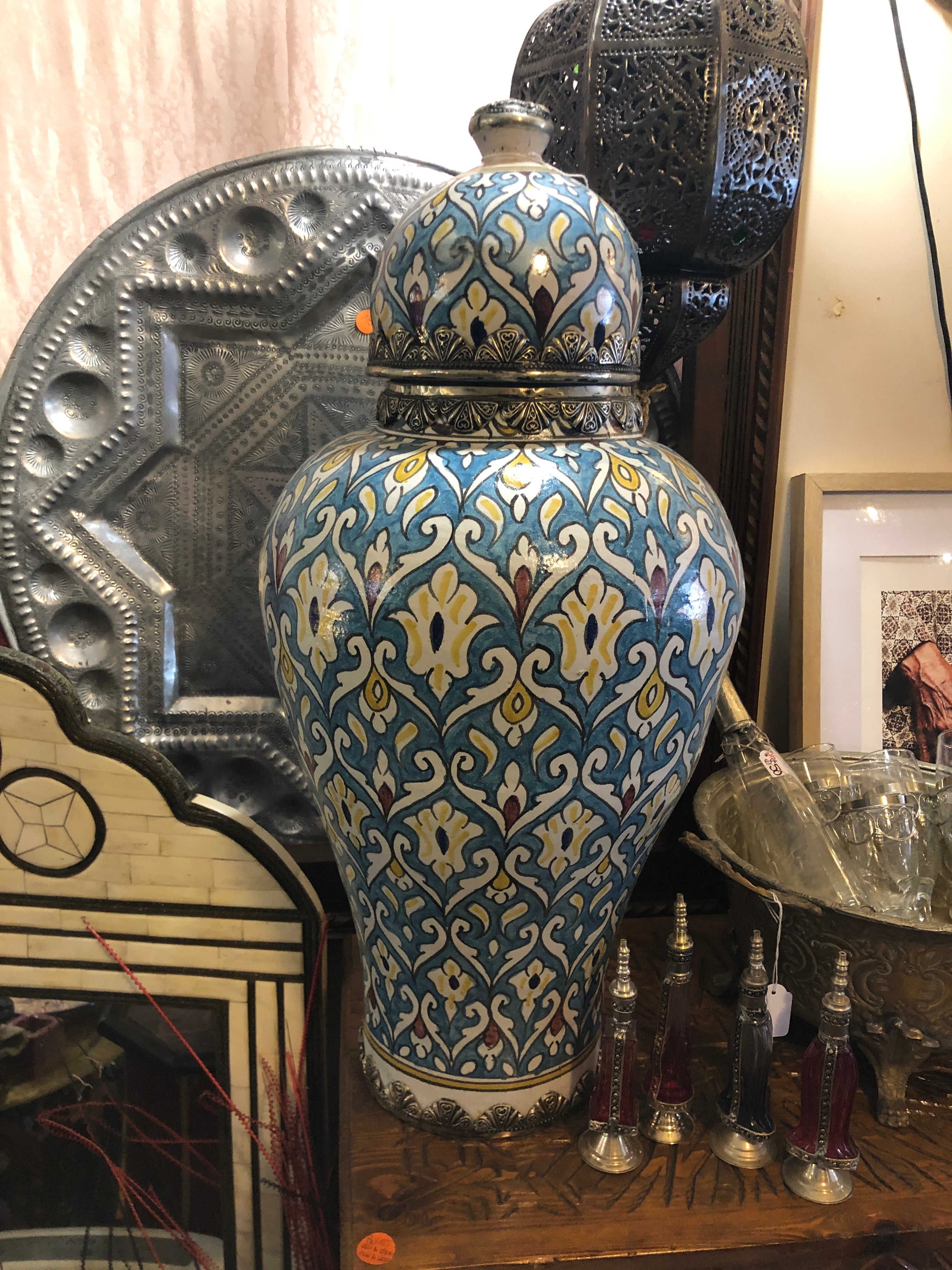 The Moorish Fez Vessel with Lid is a beautiful and authentic item from Morocco. This is certainly a special piece in an unusual and vibrant colour and luxurious size. It is made in a traditional pattern dating back to the middle ages. It's rich combination of gorgeous hues.