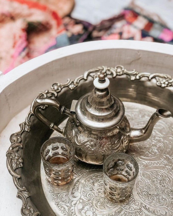 The Moroccan Silver Nickel Tray is a beautiful and authentic item from Morocco. This tray is truly something special with its gorgeous etching and pretty edging. Naturally, handmade and bought in a Moroccan bazaar where vintage items are made available on a limited basis. Our agent in Morocco keeps a look out for this kind of rare item and picks them up on our behalf.