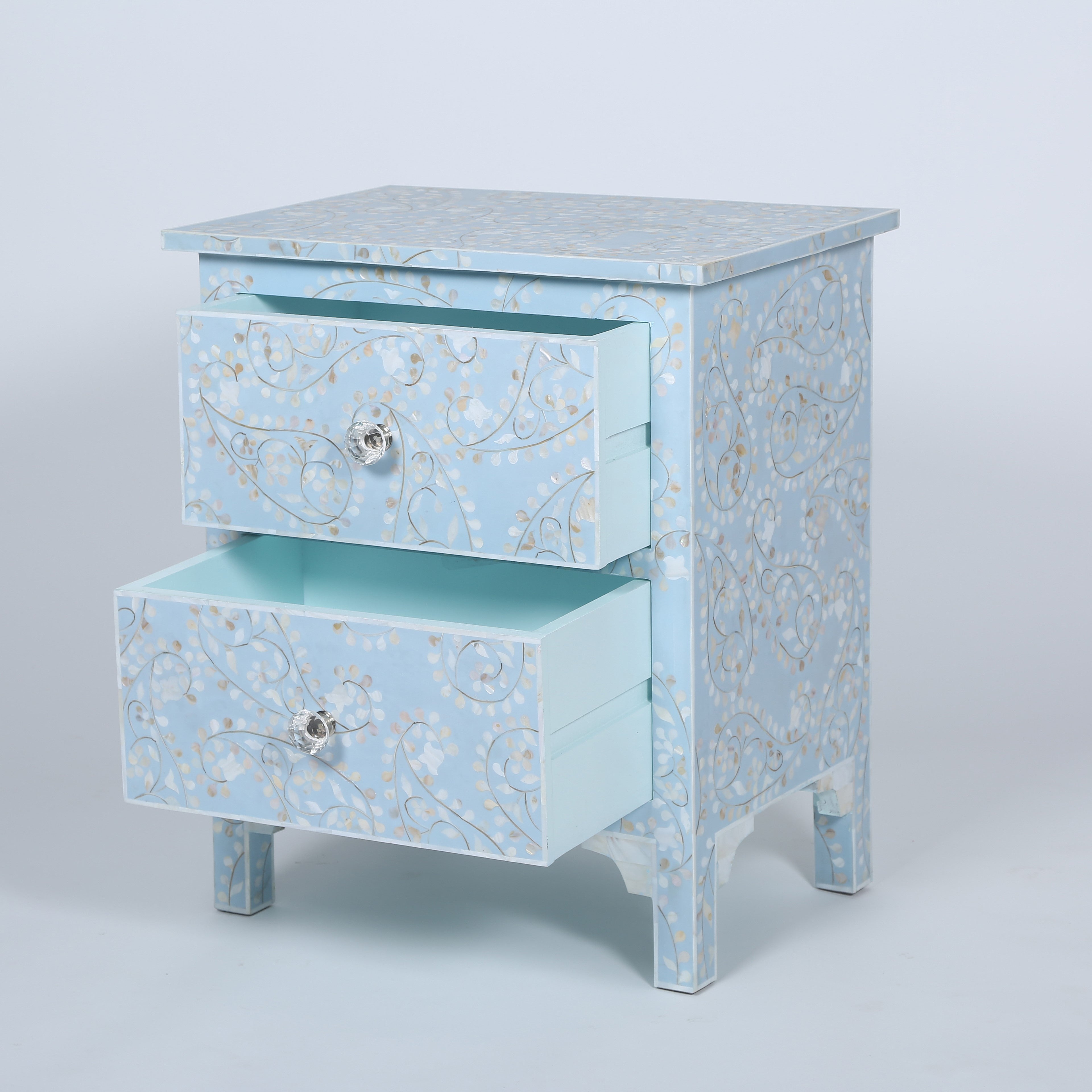 The Mother of Pearl Inlay Bedside Chest in Paisley/Blue is a striking piece and will elevate any space.