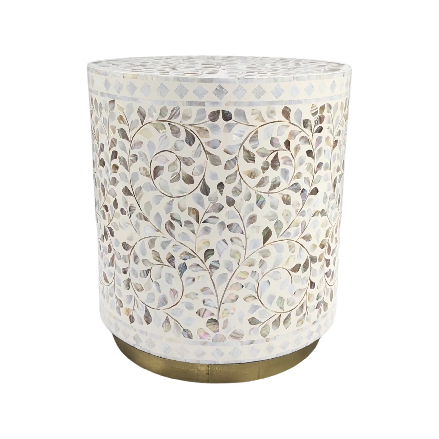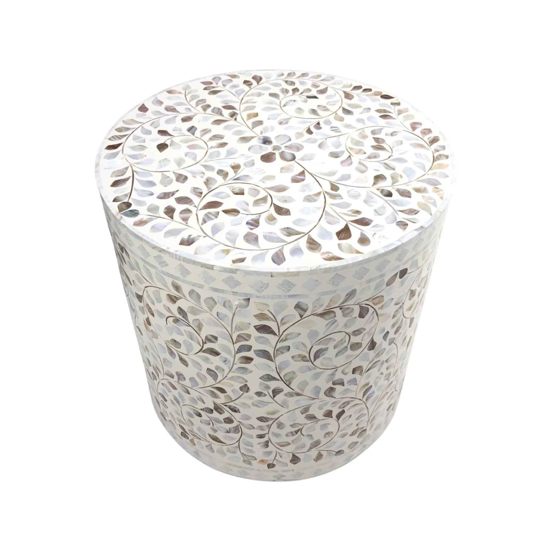 The Mother of Pearl Inlay Round Side Table/Stool in Ivory is made of Mother of Pearl abalone shell, resin and sustainably produced mango wood. It is a piece that would look beautiful and stylish in any room. This is a useful and elegant table that can be incorporated into any decor style.