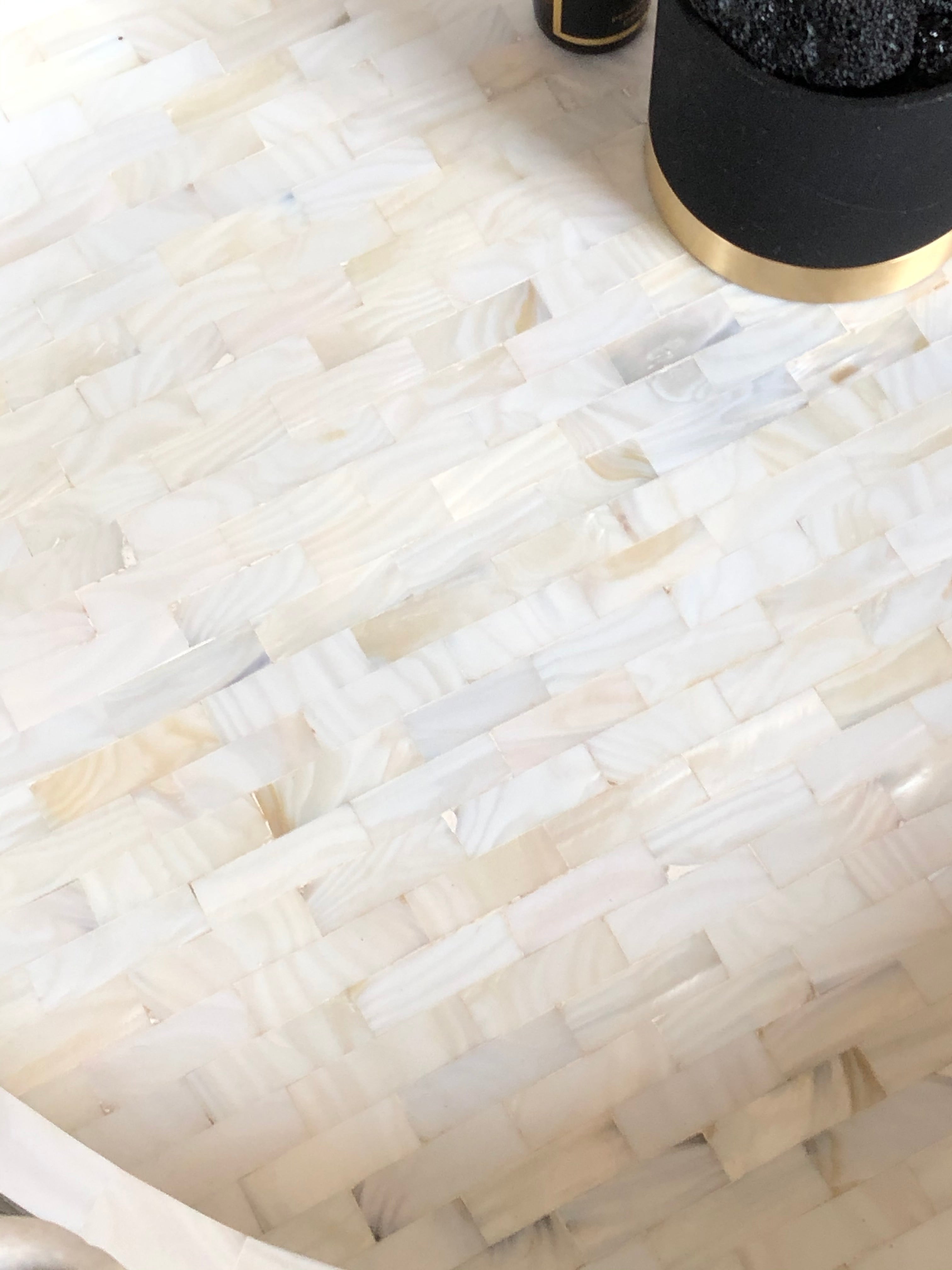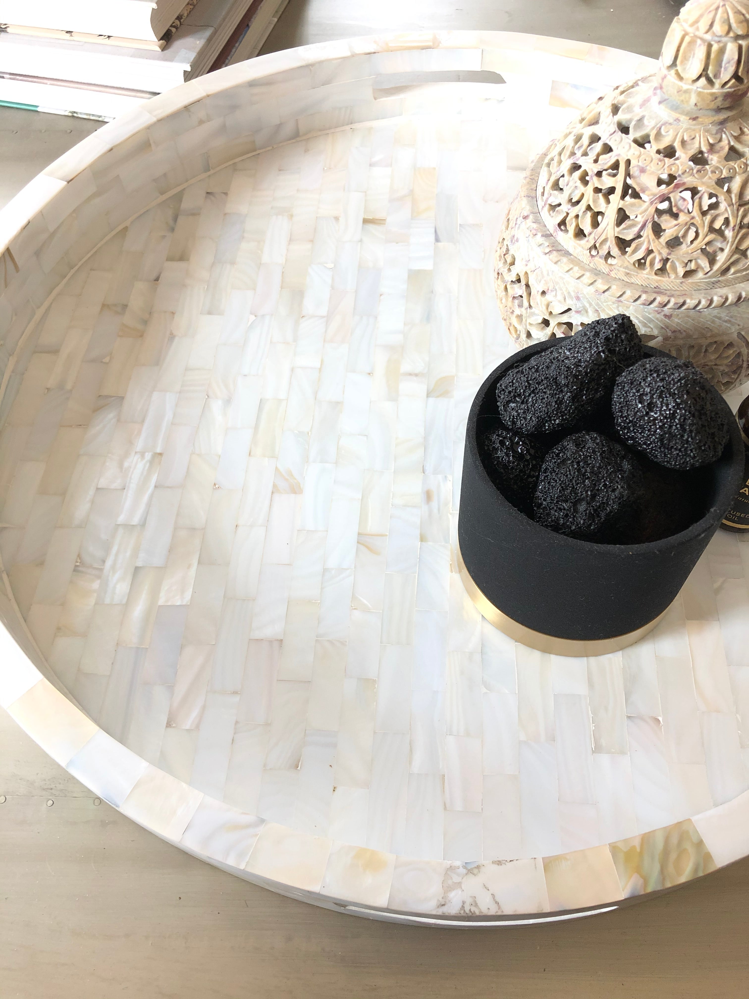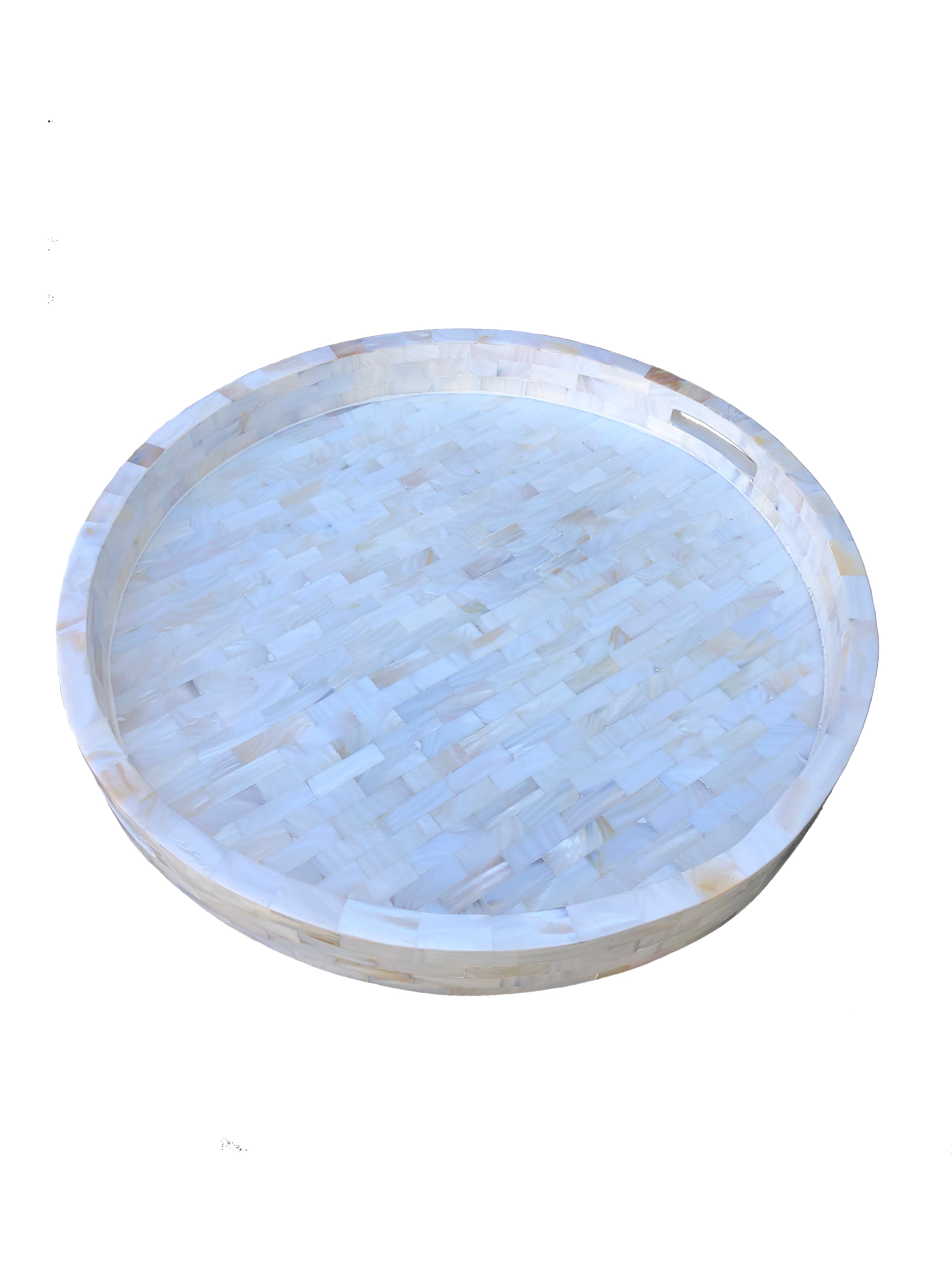 This piece is hand-made by skilled craftsman, slight irregularities in the resin and inlay may exist and it is the nature of this lovingly hand-made product. This tray has no resin as mot of our other bone and mother of pearl trays do. It's simply a beautiful collage of mother of pearl tiles making it truly a luxurious piece.