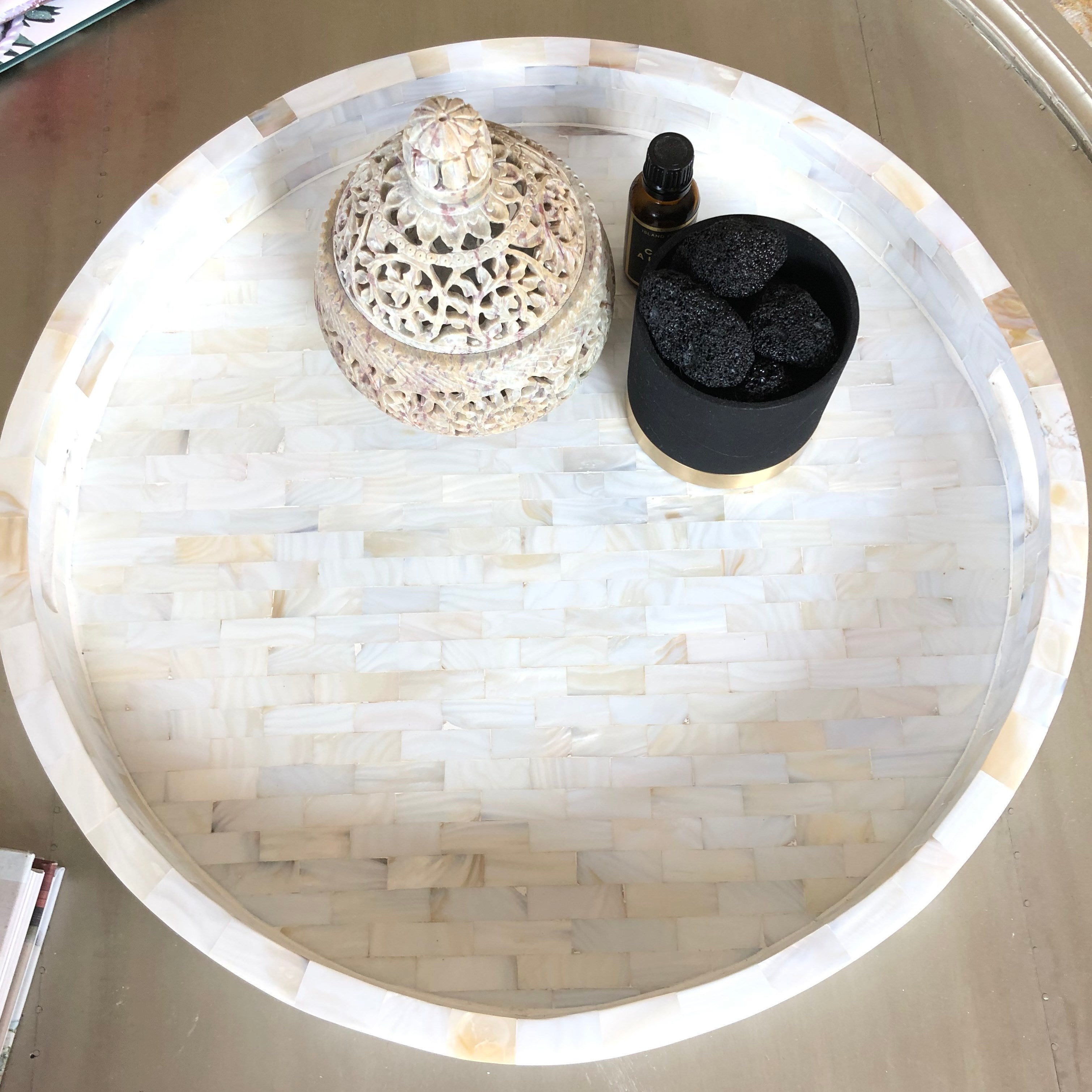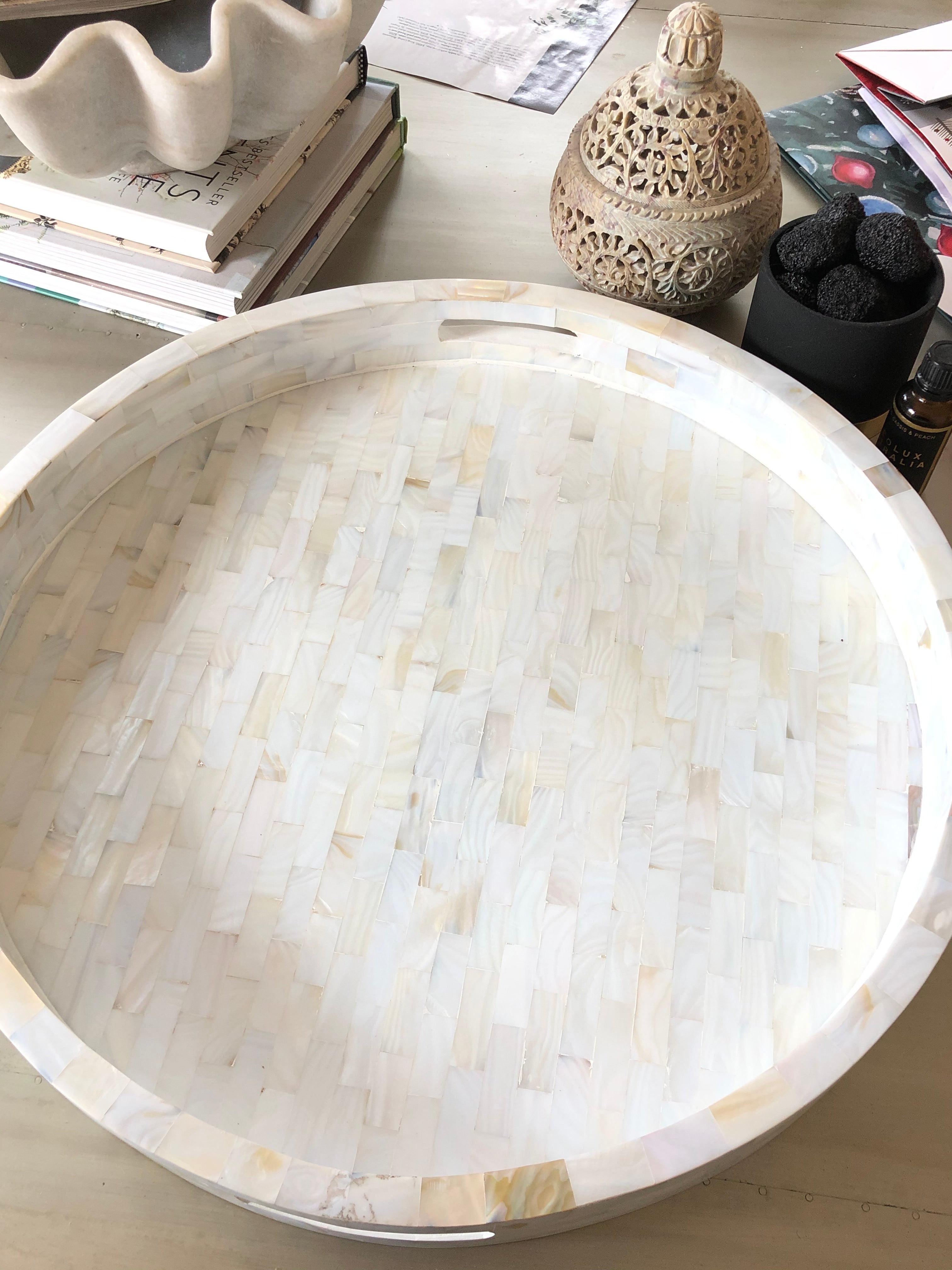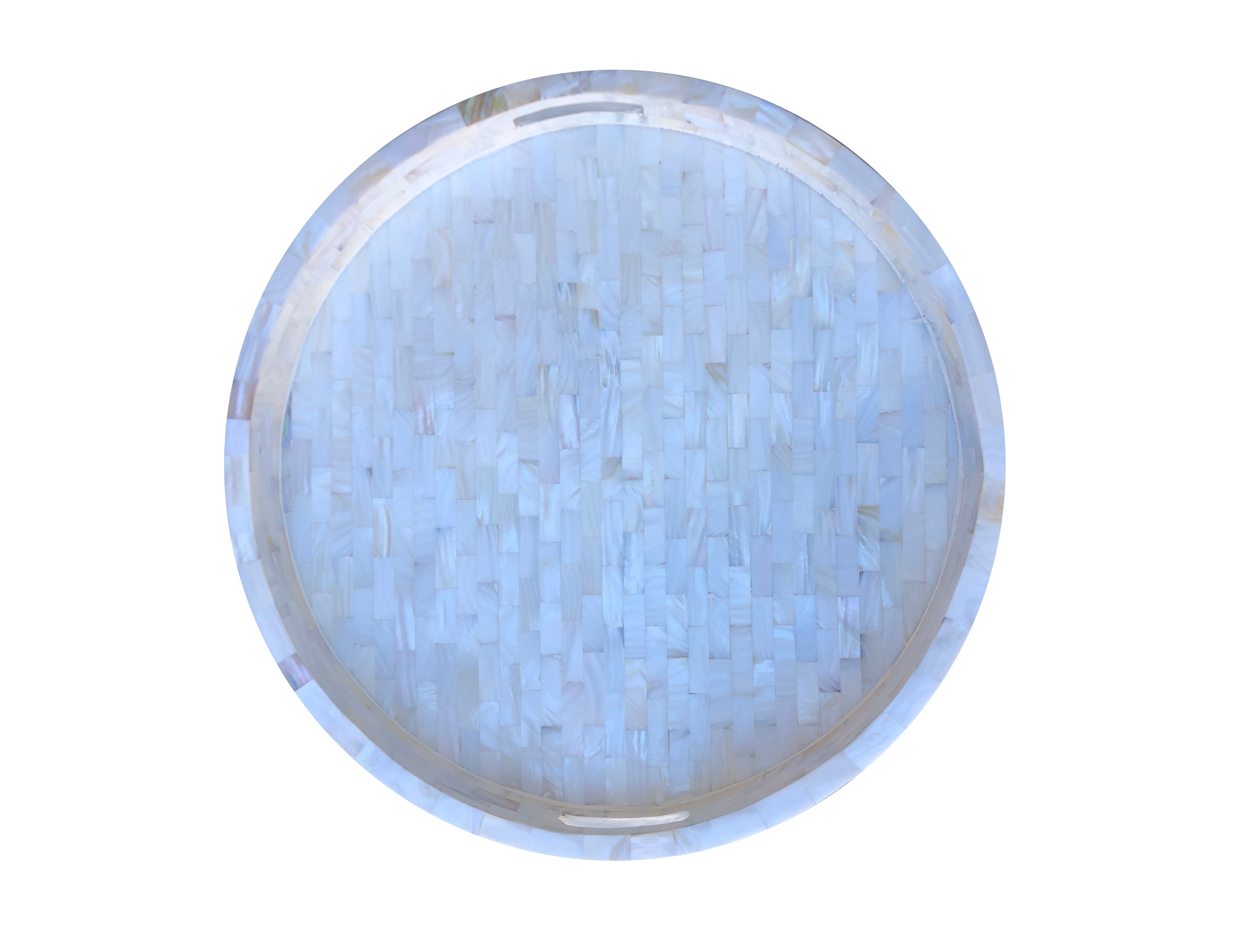 This all Mother of Pearl Round Tray is both elegant and beautiful with its intricate handmade carving and inlay.
