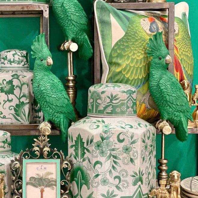 The Perroquet Sateen Cushion with Feather Infill is a beautiful pillow with rich colours and a lovely design featuring a Parrot motif. Ask us about the other pieces with the Perroquet patterning which include a stool or soap dish.