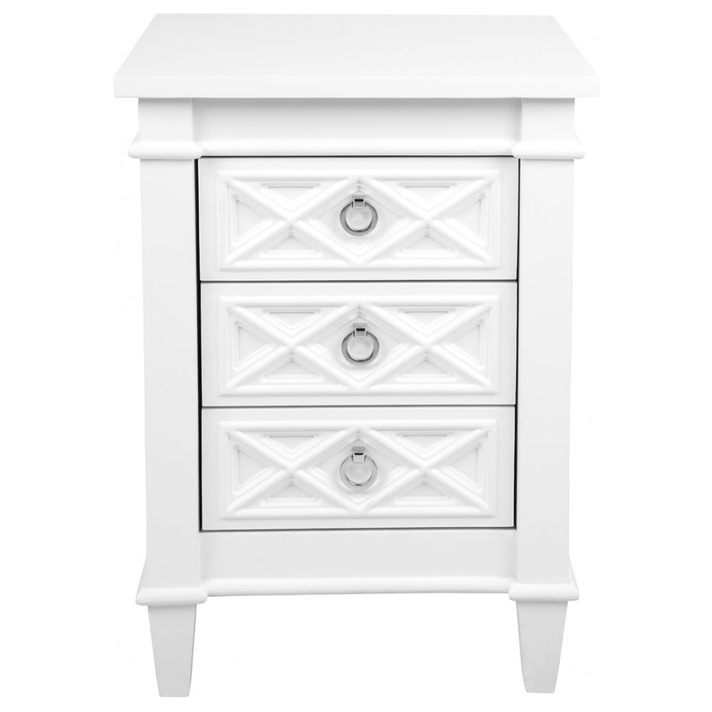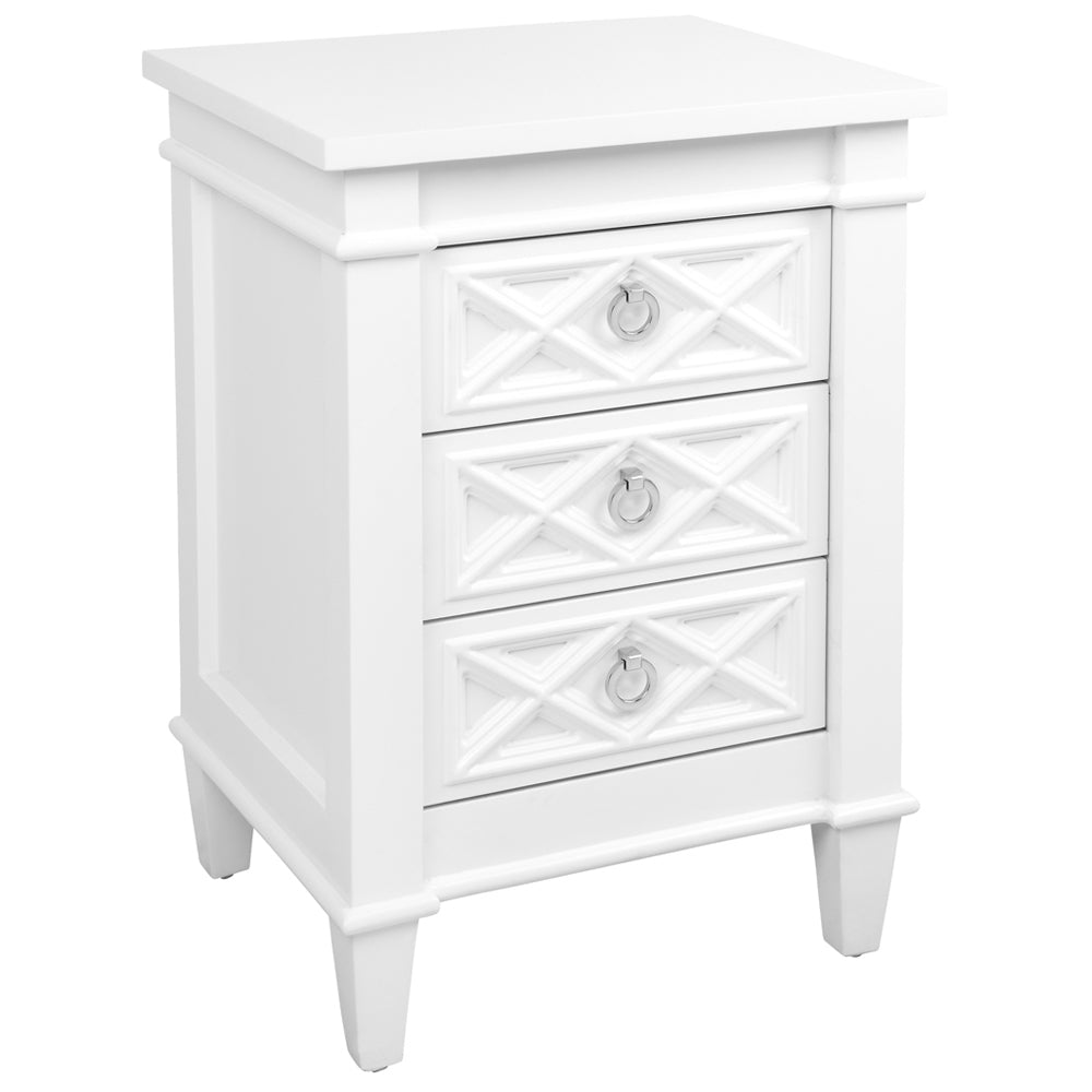 The bedside table is a white satin finished, MDF & timber frame, 3 drawer bedside table with a raised diamond pattern on the drawer fronts and polished chrome handles.