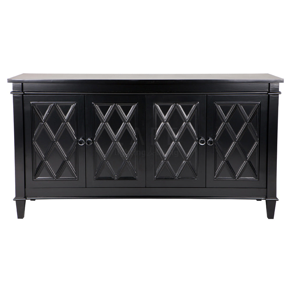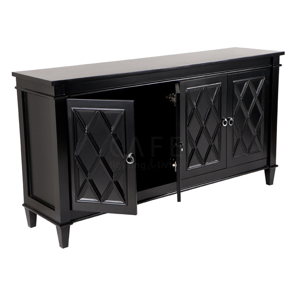 The buffet is a satin finished 4 door buffet with a raised diamond pattern on the door fronts and polished chrome handles. Single centred shelf