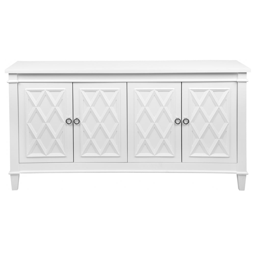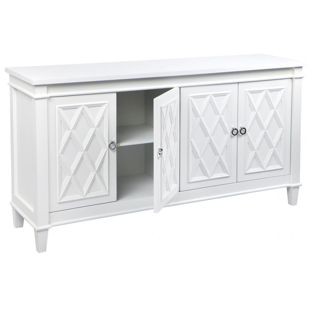 The buffet is a satin finished 4 door buffet with a raised diamond pattern on the door fronts and polished chrome handles. Single centred shelf