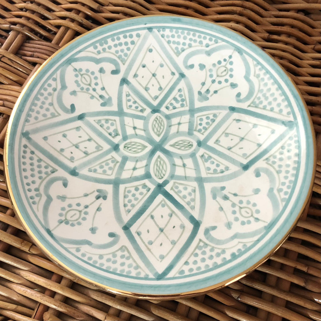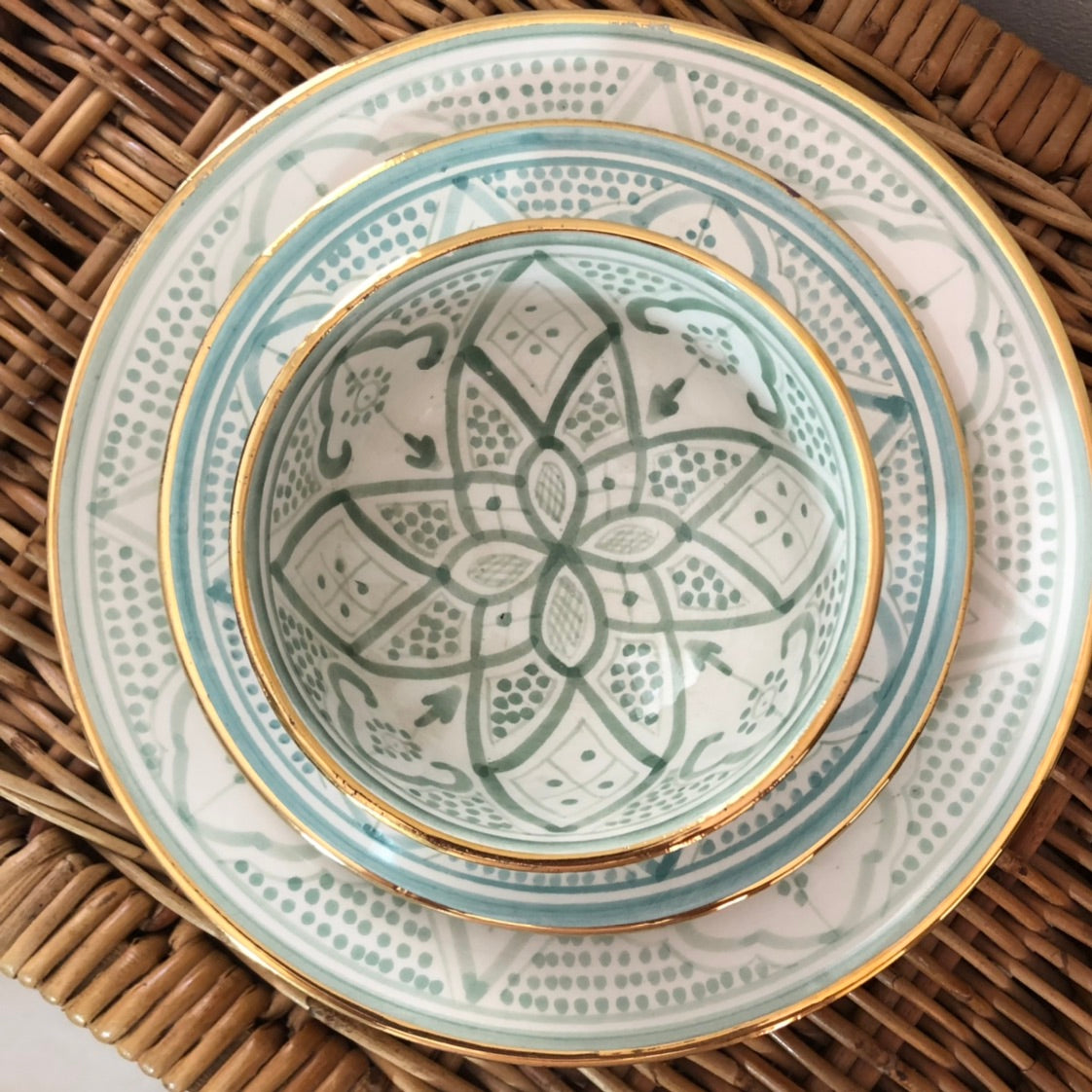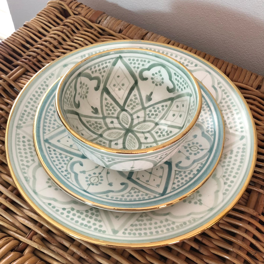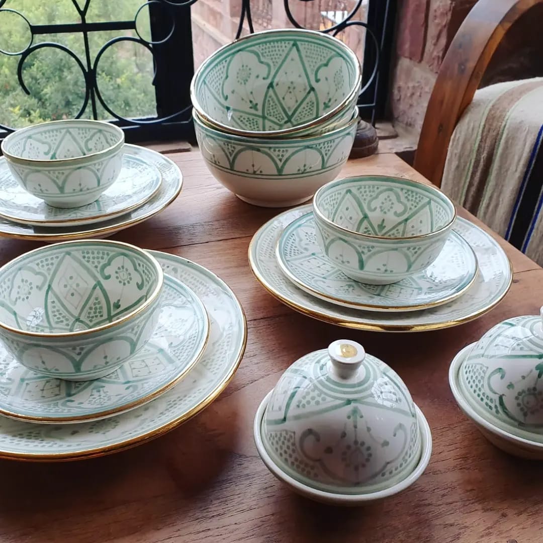The Rabat Safi Ceramics Set - Large Plate, Small Plate & Bowl is just so lovely! It's a beautiful and authentic treat from Morocco. It is made in a village in the south of Morocco in a traditional Moroccan pattern. These bowls are handmade of white Italian clay and hand painted in Safi. They are dishwasher proof.