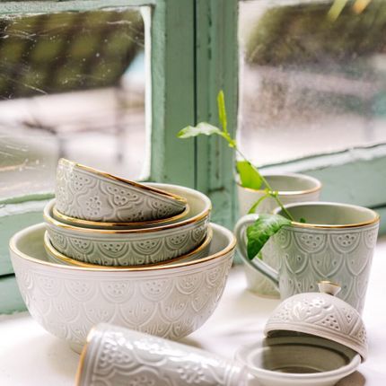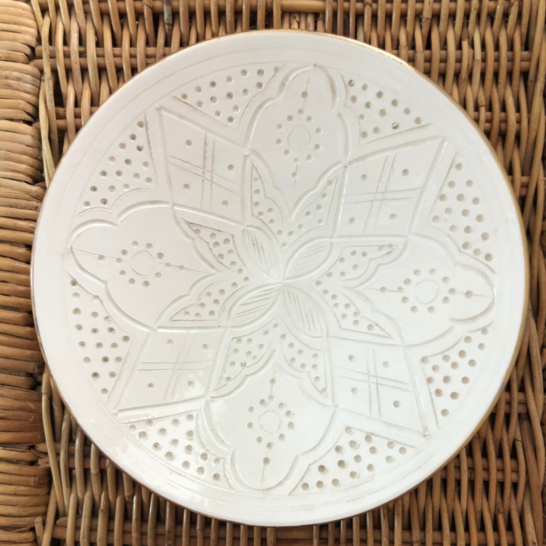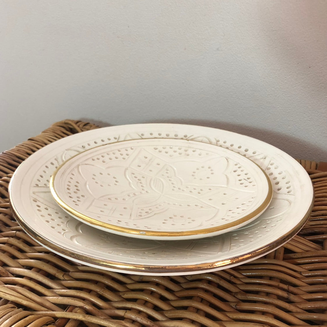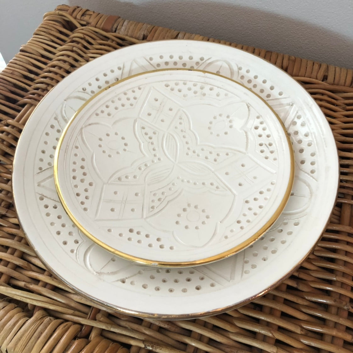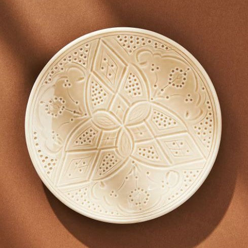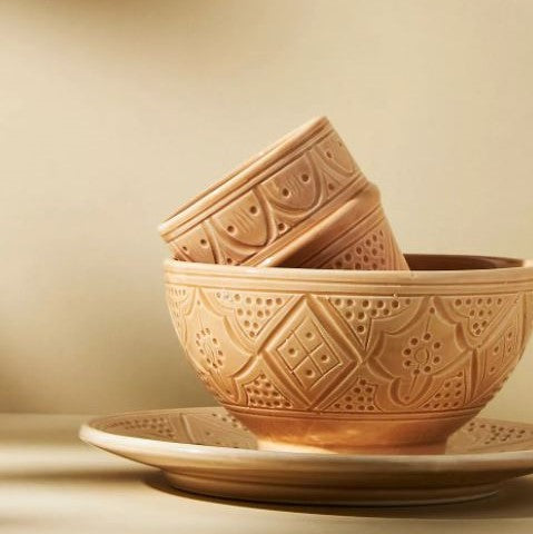 The Rabat Safi Ceramics Set - Large Plate, Small Plate & Bowl is just so lovely! It's a beautiful and authentic treat from Morocco. It is made in a village in the south of Morocco in a traditional Moroccan pattern. These bowls are handmade of white Italian clay and hand painted in Safi. They are dishwasher proof.