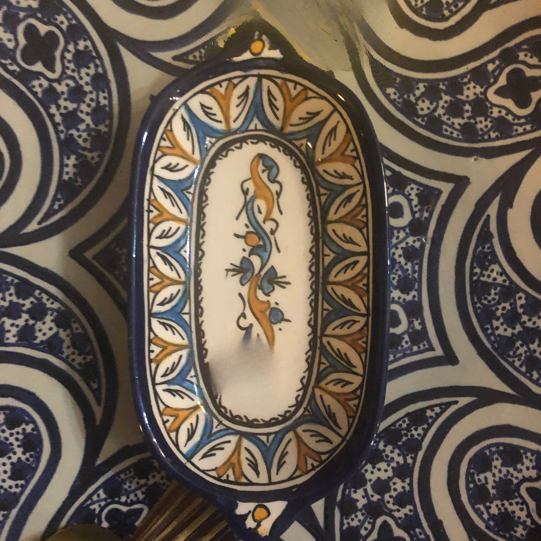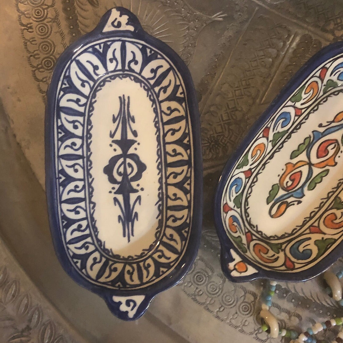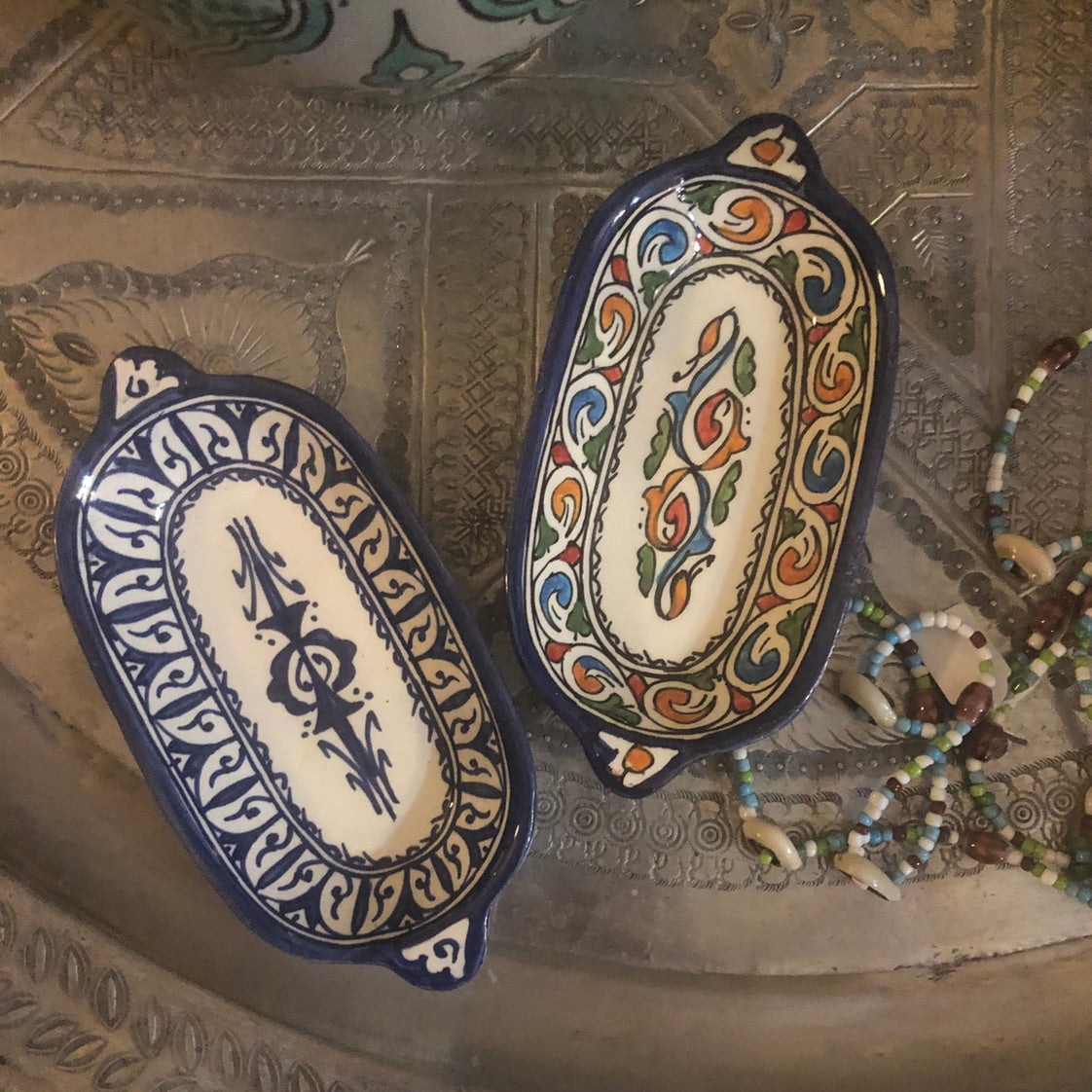 This cute little Safi Plate could be used as a dressing table/desk trinket tray, as serving-ware or styling in any living area. It's a beautiful and authentic treat from Morocco. It is made in a village in the south of Morocco in a traditional Moroccan pattern.