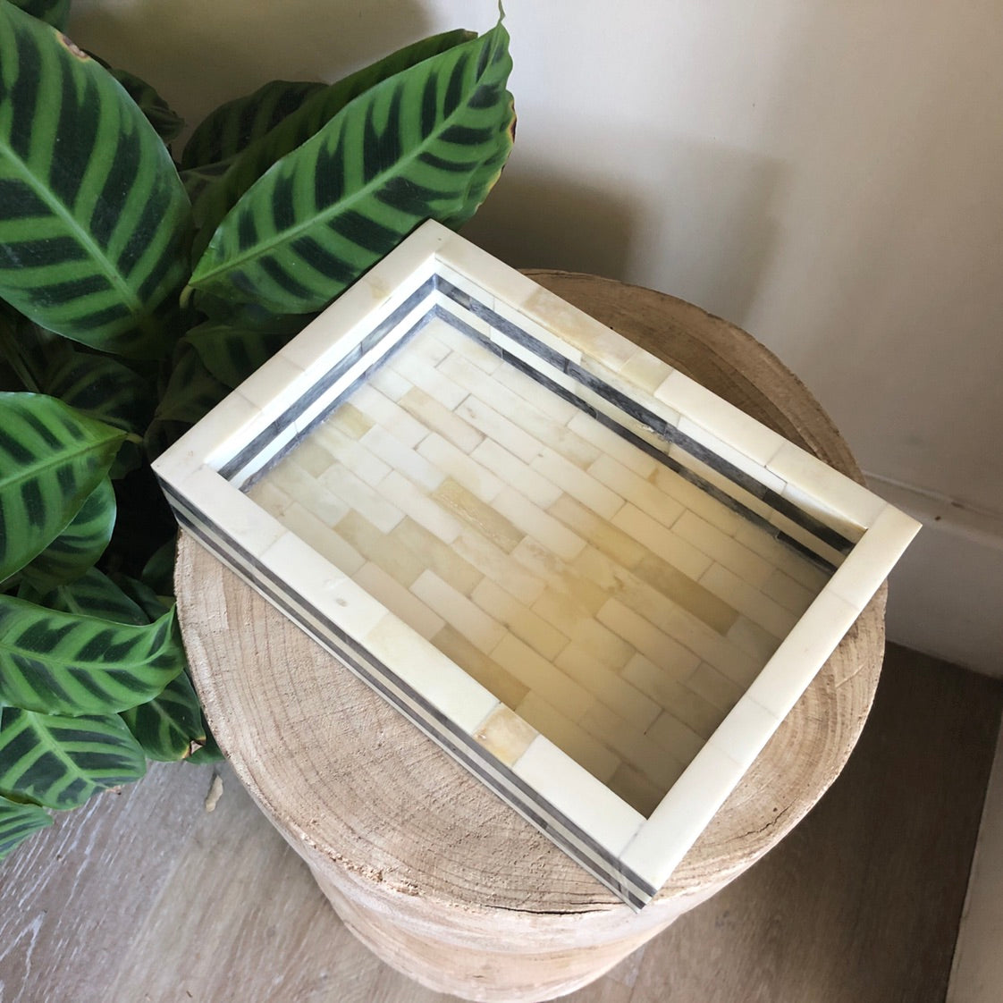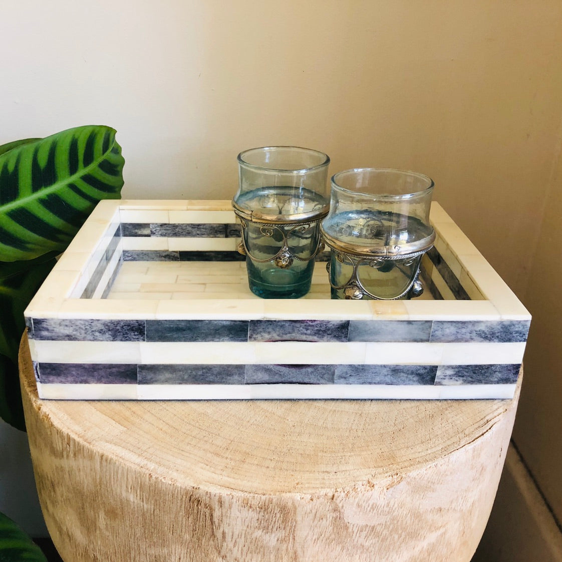 Our handcrafted trays are a stunning addition to any home either as a practical serving tray or decorative piece to match your existing décor. Stylish and functional, this grey and white bone inlay brings eclectic appeal to your vanity, entry table, coffee table or dresser. Display an array of designer fragrances, effortlessly stow makeup brushes, and skincare, then add a bold vase adorned with colourful blooms for a touch of charm and sophistication.